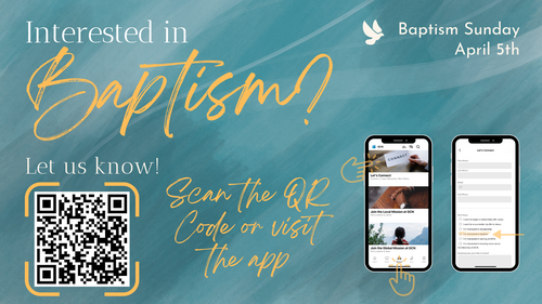 We will be having baptisms on Easter Sunday, April 5th. Please let us know if you are interested using the code above or filling out the "Let's Connect" form on the app or church website and a pastor will reach out to you.