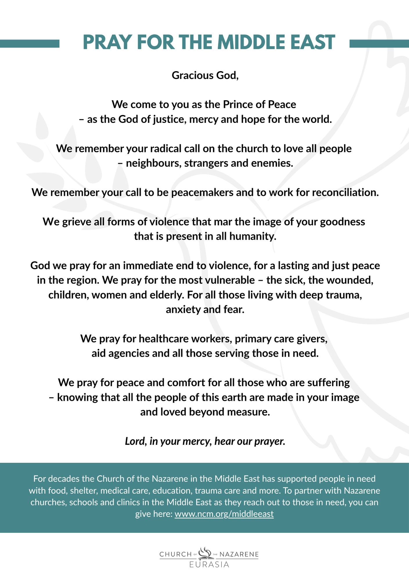 I would also encourage us, church, to make space to pray for the people in the Middle East. We pray for the peace that surpasses earthly wisdom and ways. Pray for leaders. Pray for the most vulnerable. Pray for those who are most hurting and for those serving on the frontlines with compassion. Attached to this note is a prayer that the Church of the Nazarene, Eurasia Region, released earlier this week.